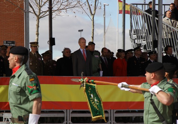 ·El ministro de Defensa presidiendo el desfile de la BRIPAC, a su lado el general Cifuentes, y a su derecha, vestida de rojo, Esperanza Aguirre que no se quitó en ningún momento la “boina negra”, que la habían concedido honoríficamente.