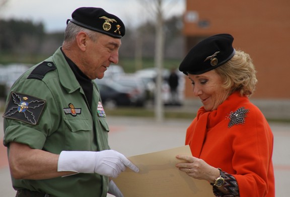 ·El general Cifuentes, Jefe de la BRIPAC, entregó a Esperanza Aguirre la “boina negra”, y el pergamino que atestigua su nombramiento como ‘Dama Almogávar Paracaidista de Honor”.