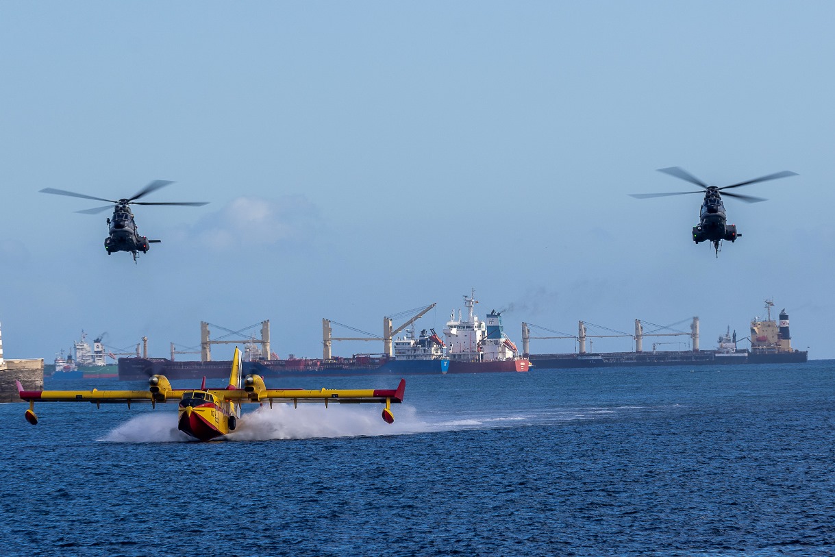 Amerizaje del CL-215T del 43 Grupo “escoltado” por dos helicópteros H215C DEL 82 grupo del Ala 46. (foto Antonio Rodriguez Santana)