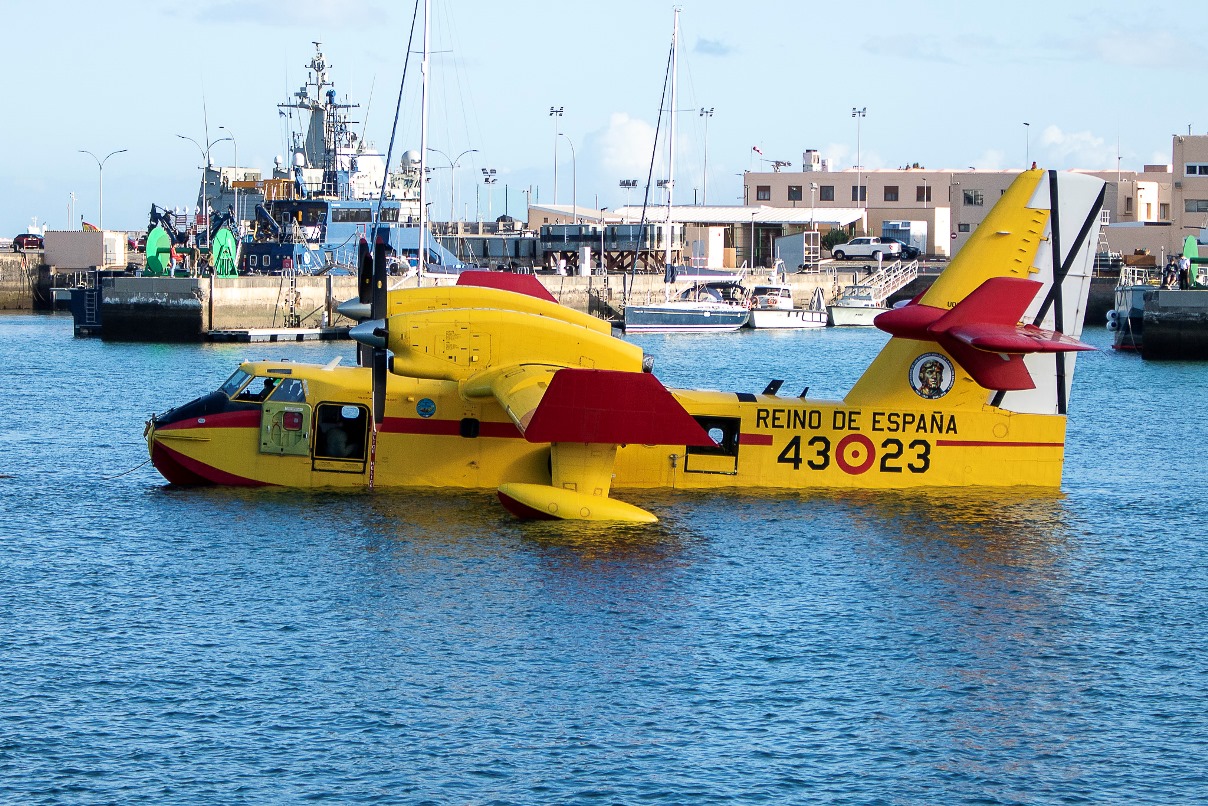 El anfibio de fabricación canadiense amerizaba procedente de la Base Aérea de Gando (Gran Canaria) escoltado por dos helicópteros Airbus Helicoptes H215 pertenecientes al 82 Grupo de Fuerzas Aérea del Ala 46 del Ejército del Aire y del Espacio, que tiene sede en dicha instalación militar canaria. EL CL-215 protagonista llevaba pintado en el fuselaje, bajo los estabilizadores horizontales, el anagrama del centenario de los Grandes Vuelos de la Aviación Española.