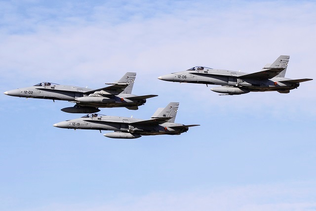 -Pasada en formación de tres de los EF-18M del Ala 12. (foto: Rubén Galindo).