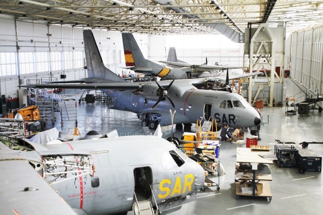 El hangar del Grupo de Material del Ala 37 lleno de D.4. El sostenimiento y mantenimiento que se hace aquí de este veterano material es clave para su operatividad a manos de los tres Escuadrones de SAR del Ejército del Aire. (foto Julio Maíz)