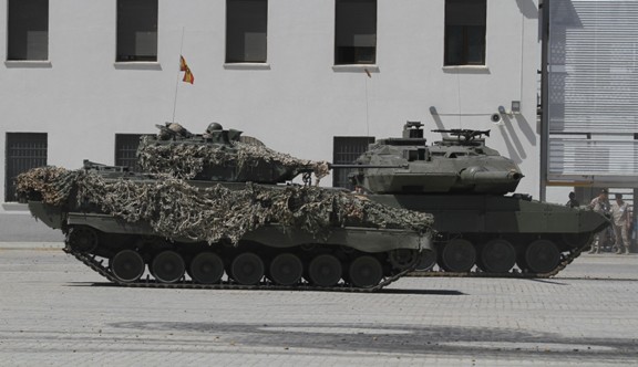 La jornada continuó con una exhibición de varios de los medios de cadenas con los que cuenta la Brigada, que comenzaron con la llegada al patio del acuartelamiento de una pieza de artillería autopropulsada M-109, que dio paso a dos carros de combate Leopard 2E y sendos vehículos de combate Pizarro.
