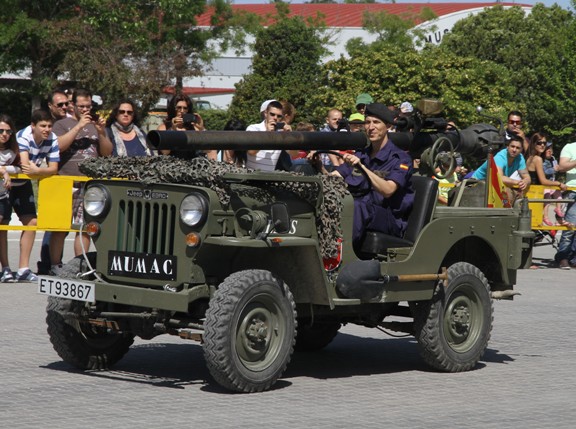 -Uno de los vehículos más interesantes que desfilaron fue este todoterreno Jeep-Ebro, denominado en el ET como “Willys”, que lleva un cañón sin retroceso de 106 m/m.