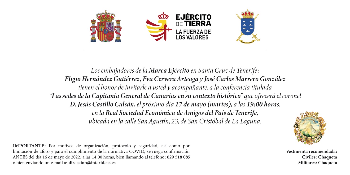 El próximo martes, 17 de mayo, a las 19.00 horas, en el Salón de Actos de la Real Sociedad Económica de Amigos del País de Tenerife, ubicada en la calle San Agustín nº 23, de San Cristóbal de La Laguna, el Coronel del Ejército de Tierra Jesús Castillo Culsán, impartirá la conferencia “Las sedes de la Capitanía General de Canarias en su contexto histórico”.