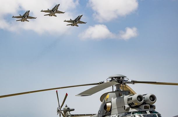 Una formación de tres F/A-18 durante el desfile aéreo, en primer plano uno de los H215. Foto: Antonio Rodríguez Santana.