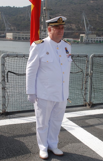 El capitán de navío Juan Escrigas Rodríguez, natural de Ferrol, recibió su despacho de Alférez de Navío en 1987. Especialista en Electrónica, estuvo embarcado en las fragatas "Asturias" y "Cataluña". Además, ha sido comandante de los patrulleros "Tabarca" y "Atalaya" y de la fragata "Blas de Lezo". Entre sus destinos en tierra cabe destacar el Estado Mayor de la Armada, Estado Mayor Conjunto y su destino como profesor en la Escuela Superior de las Fuerzas Armadas. Escrigas, Doctor en Historia Contemporánea y autor de diversos libros y artículos de historia y cultura naval, también ha estado destinado en el Estado Mayor del Cuartel General de la Operación Atalanta en Northwood, Inglaterra.