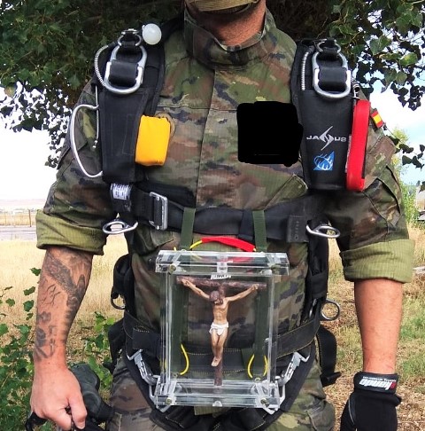 Los miembros del XIX BOEL, que forma parte del Mando de Operaciones Especiales (MOE), han aprovechado un salto manual desde un C212 Aviocar del Ejército del Aire del 721 Escuadrón, con distintas modalidades de equipación y cargas, para llevar una réplica del Cristo de la Buena Muerte, símbolo de la familia Legionaria y su protector desde 1928.