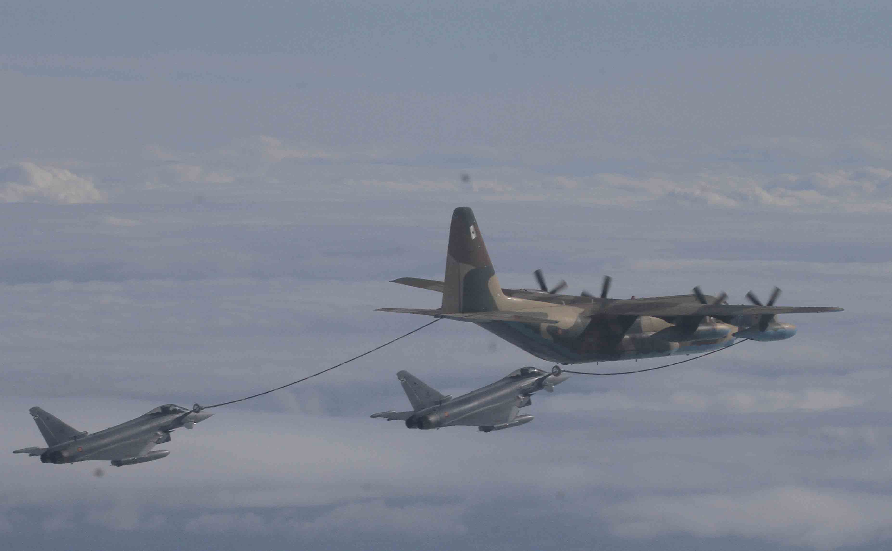 Foto: Dos Eurofighter reabasteciendose en el aire desde un KC-130H Hercules.