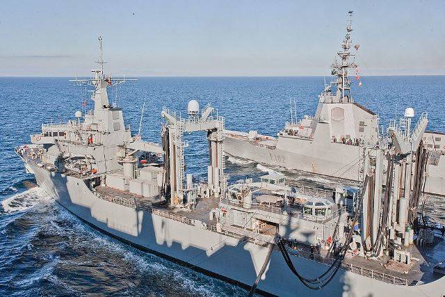 Fotografía: El buque Cantabria dando combustible a la fragata Almirante Juan de Borbón (Guillermo Álvarez Carrasco, Armada española)