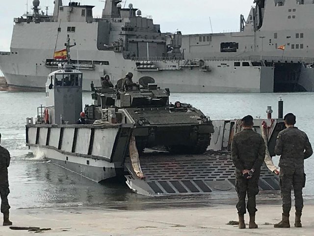 ·En cada LCM-1E de la Armada se pueden trasladar dos VCI “Pizarro”, al fondo se puede ver el LPD “Galicia”. (foto: ET/Armada)