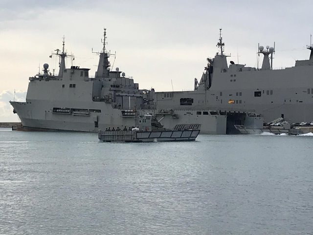 En la primera fase se llevaron a cabo las prácticas de embarque, trincado en el garaje y desembarco de vehículos en el muelle permanente de atraque del citado buque. Al día siguiente, se ensayó el desembarco de dichos medios desde el muelle inundable del buque a una playa cercana sita en el interior de la citada instalación, gracias a las lanchas de desembarco LCM (Landing Craft Mechanized)-1E del GNP (Grupo Naval de Playa), unidad de la Armada que tiene sede en el relativamente cercana Base Naval de la Carraca, sita en la localidad de San Fernando.