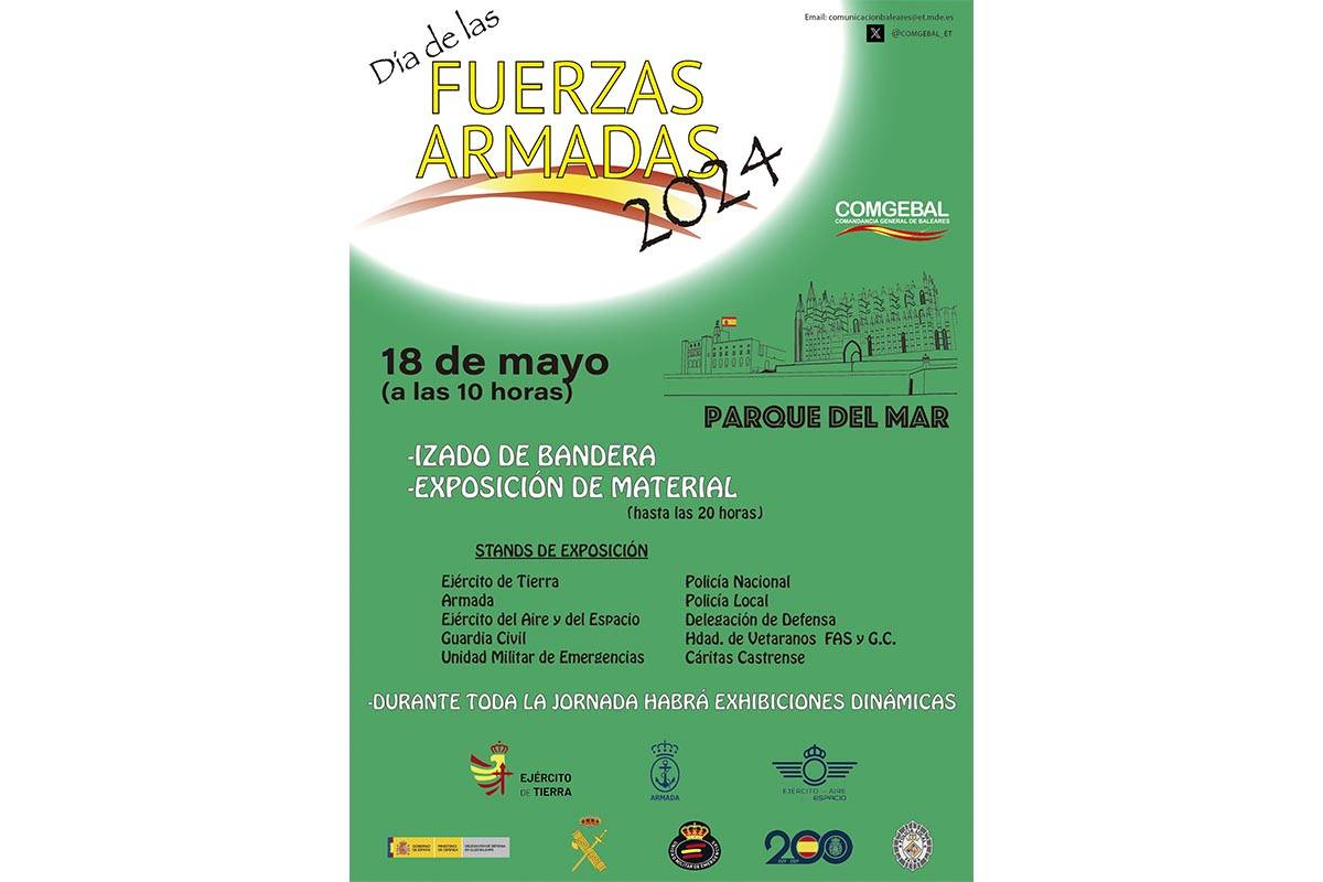 En Baleares, los componentes de la Fuerzas Armadas celebrarán su día con una serie de actos durante esta semana, entre los que están previstos los siguientes: El 18 mayo a las 10:00 h., izado de Bandera y acto a los caídos, en el Parc de la Mar de Palma de Mallorca, dando paso a la exposición de material estática y dinámica durante esa jornada, que concluirá a las 20:00 h. con el arriado de la bandera; el 23 de mayo a las 19:00 tendrá lugar el Concierto del DIFAS en el Castillo de San Carlos de Palma; y el 31 mayo a las 12:00 se producirá el relevo de la Guardia de Honor en el Palacio de la Almudaina (Capitanía).