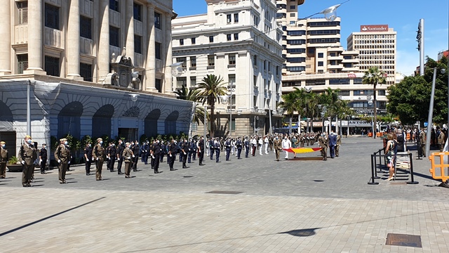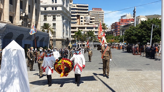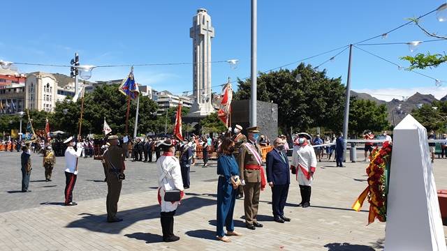 Seguidamente tuvo lugar el Acto de Homenaje a los que dieron su vida por España, donde guiones y banderines se desplazaron frente a un monolito instalado en la Plaza del Cabildo para tal efecto, depositando el teniente general Palacios una corona de laurel acompañado por los Embajadores de la Marca Ejército Eva Cervera, directora de Grupo Edefa, y José Carlos Marrero, director de Canarias en Positivo. El acto se daba por concluido tras el desfile de la Unidad de Honores y el agradecimiento del General Jefe del Mando de Canarias a los asistentes por su presencia.
