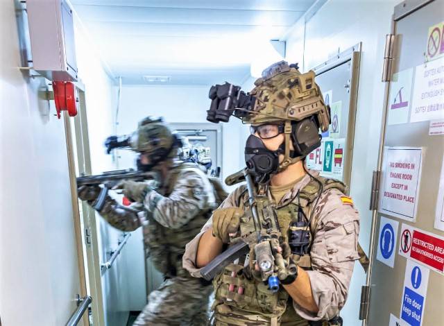 Fotografía: El subfusil MP5 es una todavía un arma eficaz en espacios confinados como los pasillos y mamparos de un buque. (foto Armada)