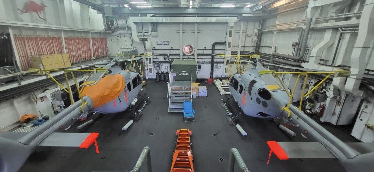 Imagen de dos H135 en el amplio hangar del “Cantabria”. (foto FLOAN)