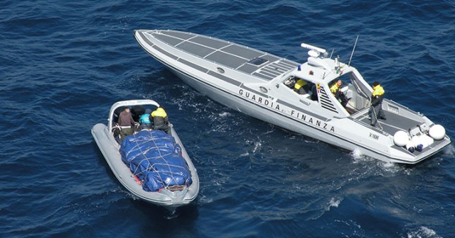 Lancha rápida de la Guardia di Finanza con la embarcación detenida. Foto: Guardia Civil.
