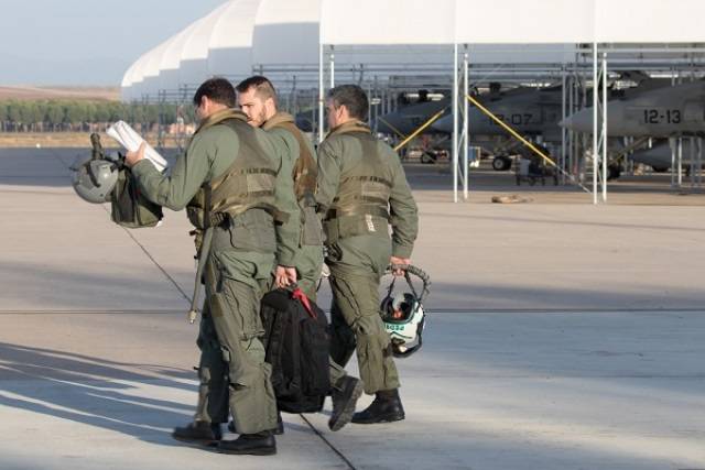 ·Pilotos del Ala 12 se dirigen a sus cazabombarderos EF-18 sitos en la plataforma de la Base Aérea de Torrejón (Madrid). (foto Javier Sánchez)