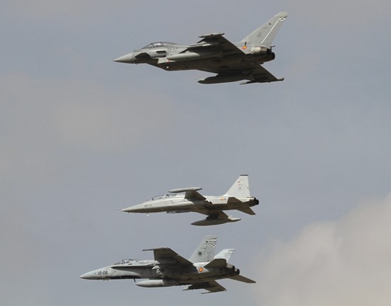 1-Pasada de una formación mixta compuesta por un Eurofighter (arriba), un Northrop F-5B (en medio), y un Boeing EF-18M (abajo).