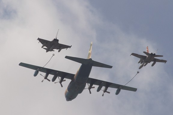 2-Las pasadas simulando un reabastecimiento en vuelo son siempre vistosas, como la que ha protagonizado un cisterna Lockheed Martin KC-130H Hercules en compañía de un Eurofighter (izquierda) y un EF-18M, sobre los cielos de Madrid.