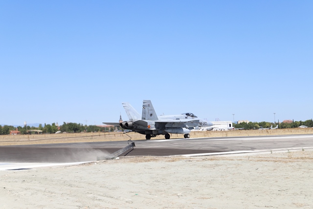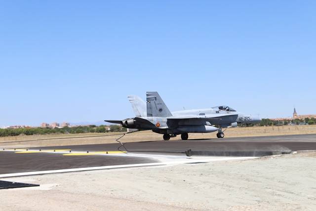 En el verano del año pasado se sustituyó la barrera de frenado de la otra cabecera de pista, mediante la instalación de un sistema de frenado retráctil , que se completa este año con una barrera del mismo tipo en la segunda cabecera. El enganche se programó al regreso de una misión de entrenamiento del F-18 en el Polígono de Bardenas (Navarra). Consistió en acelerar el caza hasta los 90 nudos (180 kilómetros por hora), con una carga de 30 000 libras (14.000 Kilogramos) de combustible, y efectuar el enganche, comprobándose a continuación la distancia de frenado, que fue de 238 metros. El avión quedó centrado en el eje de la pista y los sistemas de frenado se sincronizaron correctamente. Posteriormente se procedió a la suelta del avión, y recogida del cable, resincronización de los sistemas de frenado y puesta en servicio de todos los sistemas. En realizar toda la prueba se tardó un tiempo de tan solo 17 minutos.
