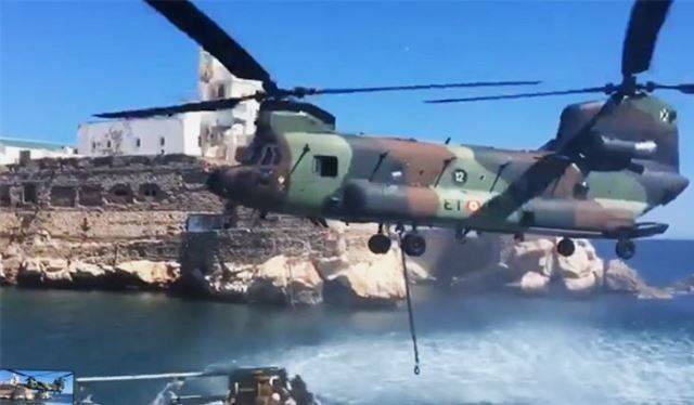 Fotografía: Un helicóptero de la Aviación del ET CH-47D “Chinook” abasteciendo el islote/peñón de Alhucemas. (foto Armada española).
