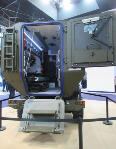 También pudimos analizarla en persona aprovechando su presencia en la última edición de la feria parisina Eurosatory y en la española FEINDEF. Esta configuración se basa en la incorporación al chasis de cabina sencilla del VAMTAC de una célula con protección balística y contra minas según la normativa estandarizada STANAG 4569 de la OTAN lo que permite al vehículo operar en las mismas condiciones de protección que el resto de unidades a las que apoya, lo que incluye además protección NBQ. El amplio tamaño de la célula protegida permite la instalación de equipamiento médico especializado. (José Mª Navarro García)