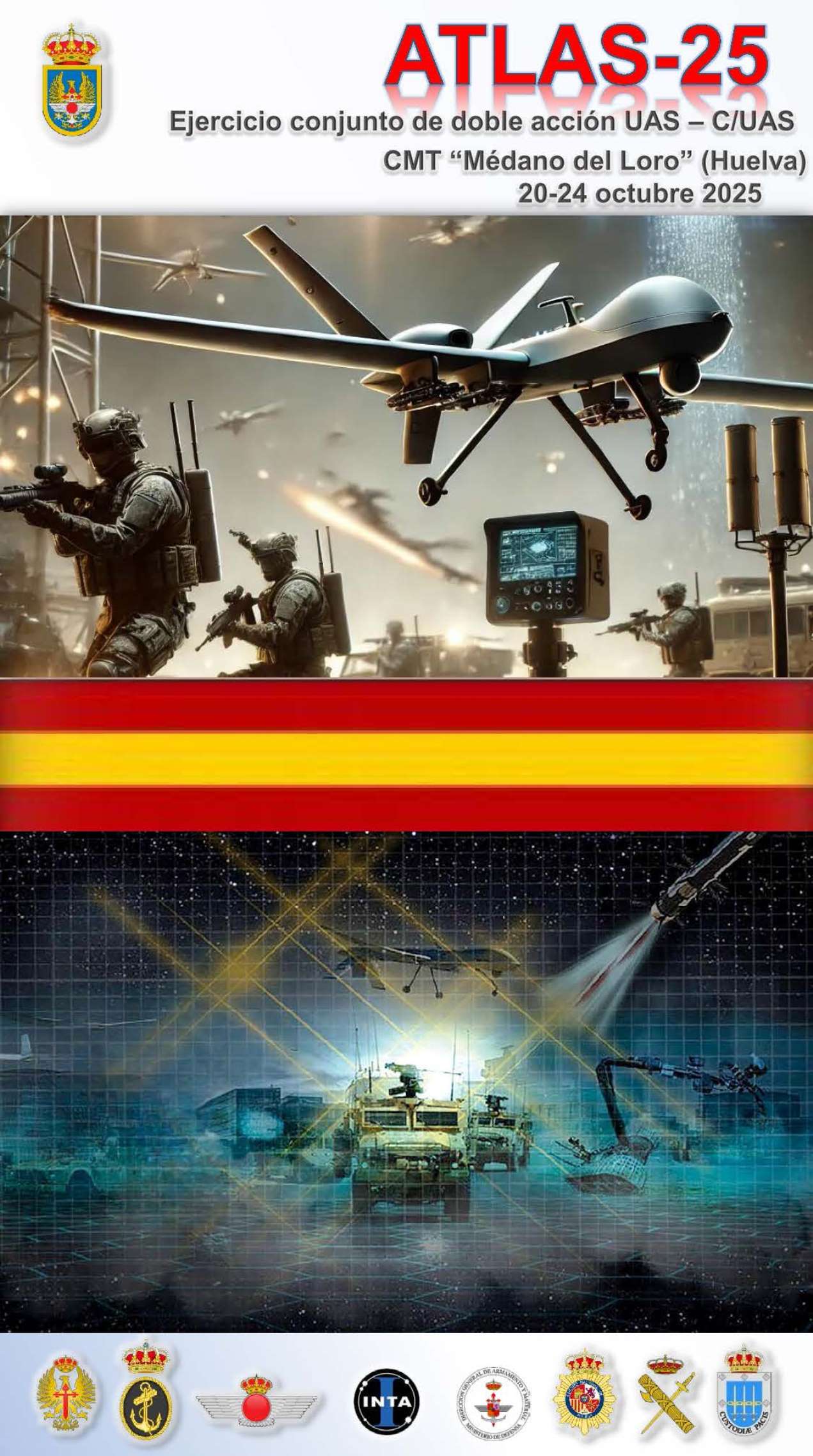 Del 20 al 24 de octubre, unidades del Ejército de Tierra, la Armada y el Ejército del Aire y del Espacio, junto con unidades de la Guardia Civil (GC) y el Cuerpo Nacional de Policía (CNP), desplegarán y se integrarán bajo un mando único en el ejercicio “Atlas 25” para responder de forma efectiva ante una amenaza aérea multi-capa y, en especial, contra los drones.