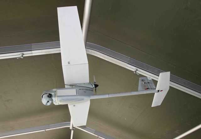Fotografía: Raven RQ-11B DDL de la EADA, obsérvese delante la cámara orientable. Foto Julio Maíz.