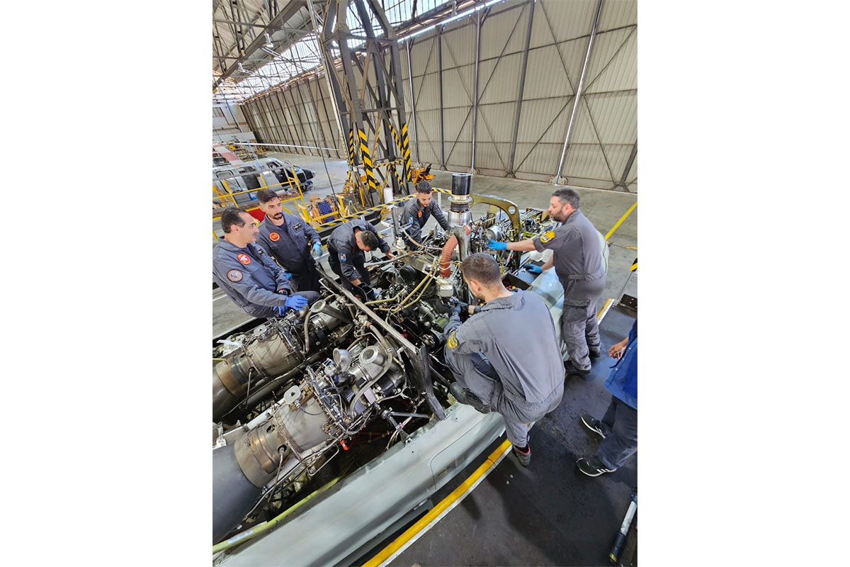 Mecánicos del Ala 49 aprenden de sus compañeros de Armilla el mantenimiento de los motores Turbomeca Ariel 1S1, de los que 2 propulsan el S-76C. (foto Ala 78)
