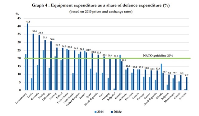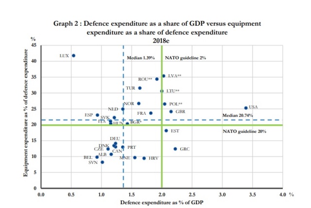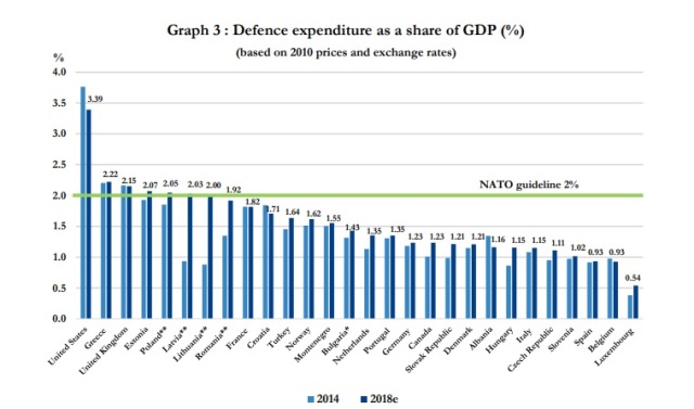 España sigue manteniéndose a la cola en lo que a asignación presupuestaria para Defensa se refiere, con un 0,93 % del Producto Interior Bruto (PIB), dato que comparte con Bélgica y que solo supera a Luxemburgo con un 0,54 %. Se repite el mismo puesto que en 2017 según os cálculos de la OTAN. Aunque insuficiente, los cálculos de la OTAN muestran un incremento del 6,12 % respecto a las cifras del año anterior, hasta los 11.276 millones de euros según cálculos de la Alianza, que cifra en 121.000 los efectivos de los que dispone las Fuerzas Armadas (el séptimo país de la OTAN con mayor personal militar).