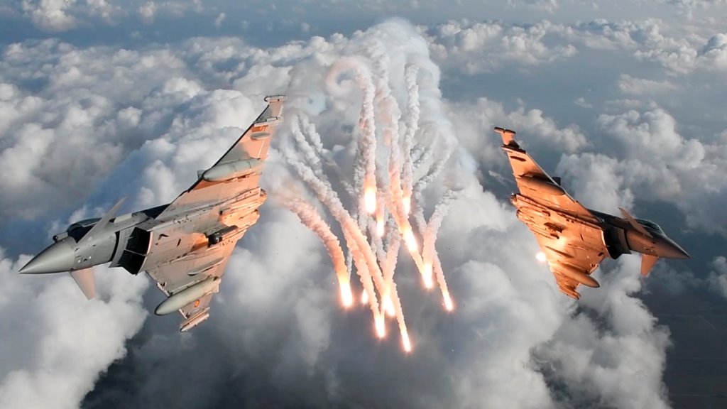 Los de los Eurofighter del Ala 11 lanzando las bengalas durante el vuelo de posado fotografico. (foto EMAD)
