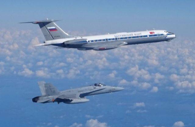 Fotografía: Un EF-18 del Ala 15 escoltando un Tu-134AK del AVFR. (foto OTAN)
