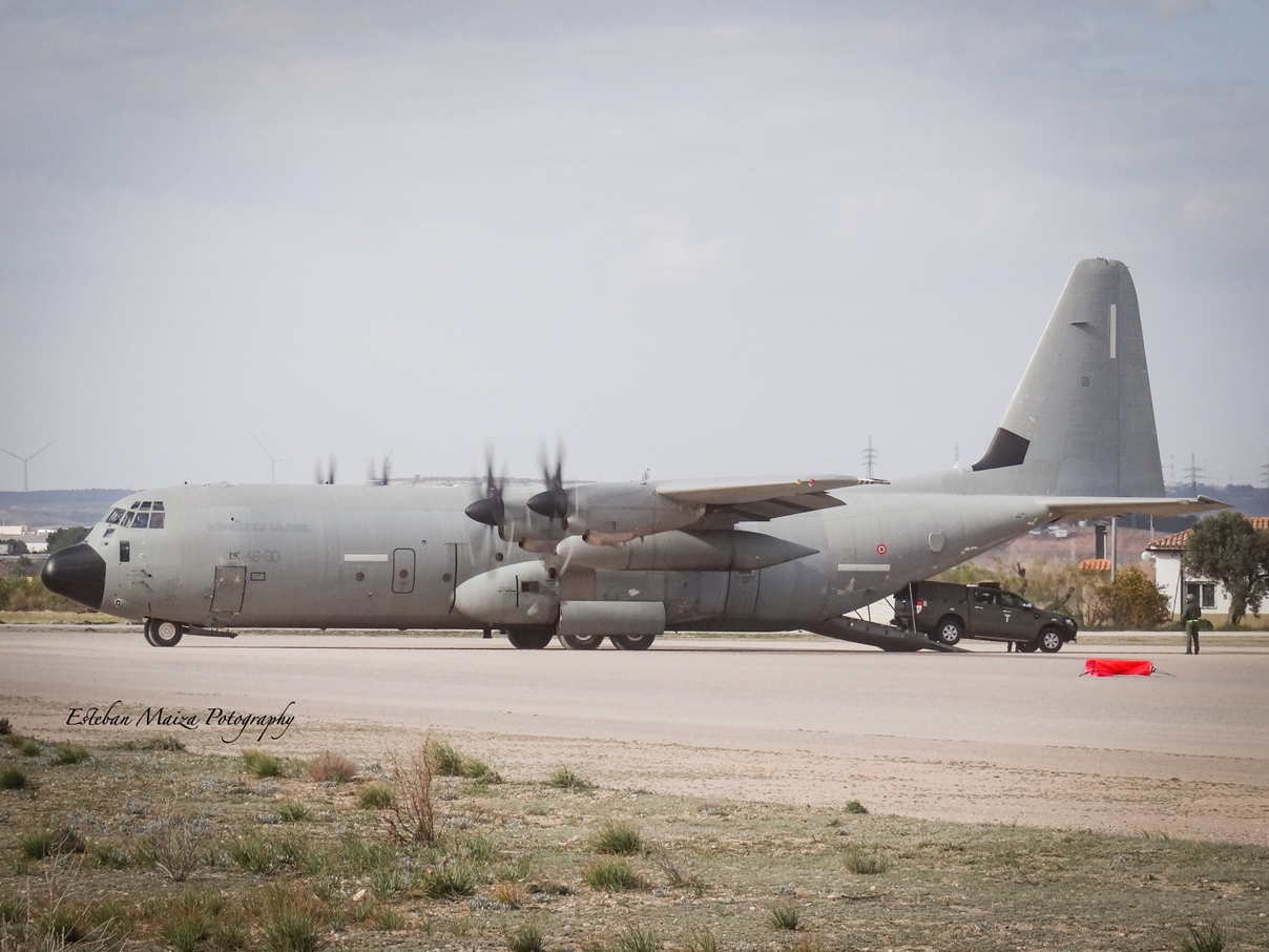 Un C-130J Súper Hércules de la Aeronautica Militare italiana descargando un vehículo en el aeródromo militar de Ablitas. (Esteban Maiza)