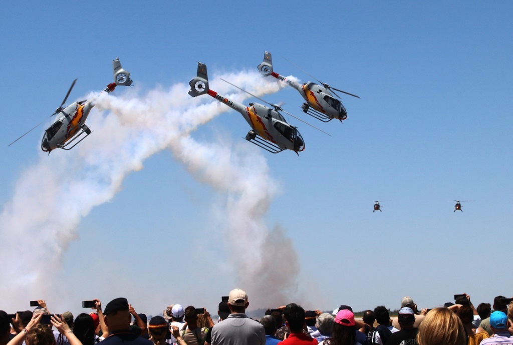 La patrulla “Aspa” deleito con las evoluciones de sus H120 a los 15.000 asistentes al festival aéreo de Morón. (Foto Julio Maíz)