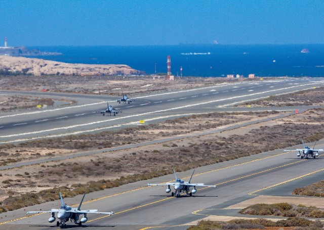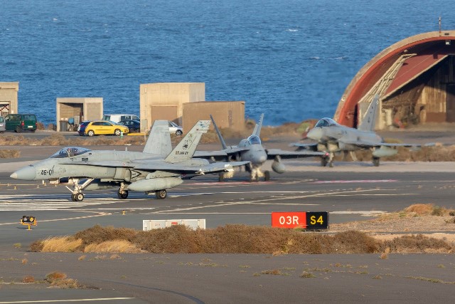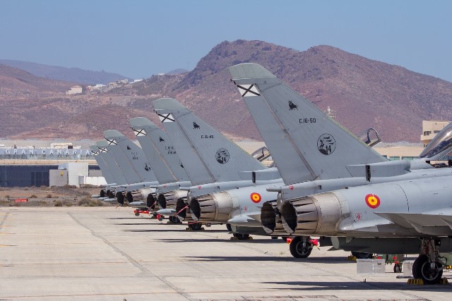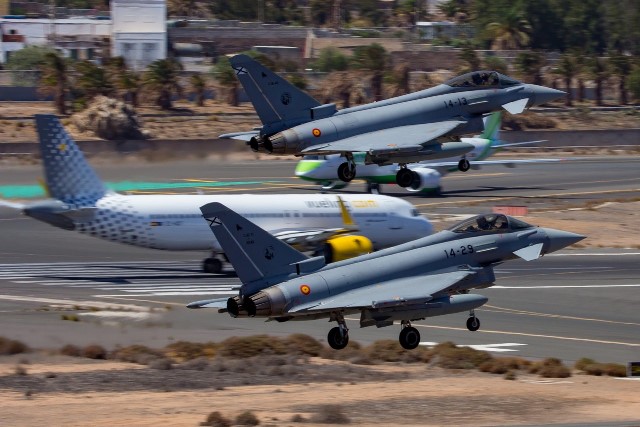 El Ala 14 de la base aérea de Albacete ha desplegado en la base aérea de Gando seis Eurofighter, junto con sus pilotos, mecánicos y personal de apoyo, para la realización de una semana de entrenamiento con los F-18 del Ala 46 y el Grupo de Alerta y Control (GRUALERCON). Los Eurofighter aterrizaron en Gando, escoltados por los F-18 de Canarias desde su entrada en el espacio aéreo de responsabilidad.