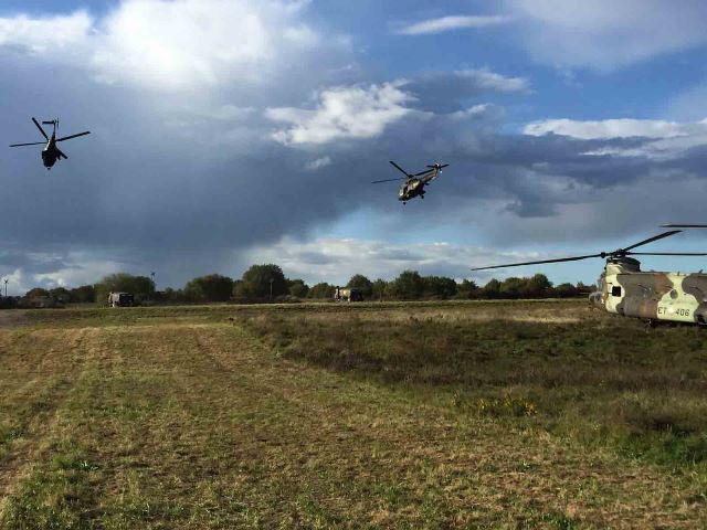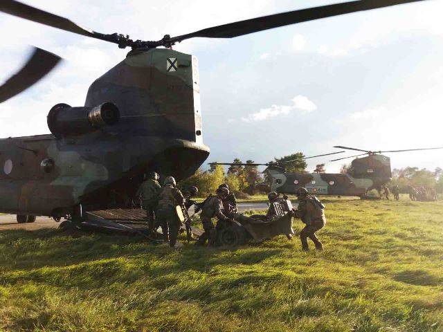 ·Un Chinook a punto de despegar al fondo se ven ya en vuelo los dos aparatos del BHELMA IV. Foto: FAMET.