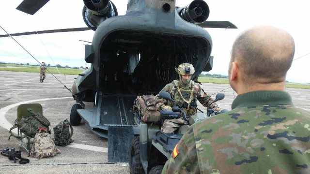 ·Un miembro de la tripulación del Chinook dirige la salida del aparato de un quad Polaris Sporstman 700 del Armée de Terre. Foto: FAMET.