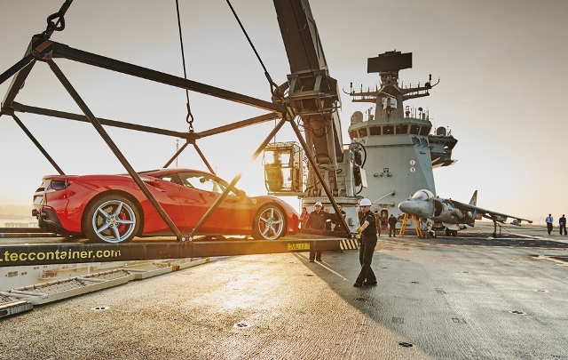 Fotografía: Momento en el que el Ferrari 488 GTB sube a bordo del Buque de Proyección de la Armada española.