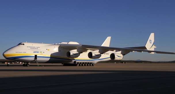 ·El gigantesco Antonov-225, fácilmente distinguible por su propulsión de seis turbinas y sus 32 ruedas, en la plataforma de la Base Aérea de Torrejón de Ardoz (Madrid).