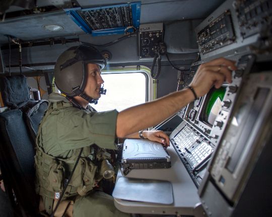 ·Operador dentro de la cabina del helicóptero de la Armada durante uno de los vuelos realizados en los ejercicios.