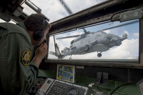 ·Personal de la unidad aérea embarcada durante una toma del helicóptero sobre la cubierta del buque.