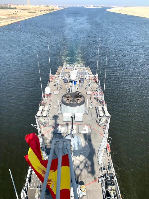 Tras cruzar el Mediterráneo el navío español llegaba al Canal de Suez, especialmente vigilado por la amenaza de atentados de terroristas islámicos asentados en El Sinaí. En el curso de este paso se han realizado las fotografías adjuntas de la fragata a vista de pájaro, tomadas desde la parte más alta del palo mayor, desde donde se aprecia pintada en la cubierta las siglas F-84, para reconocimiento aéreo, entre el montaje artillero de 76,2 mm y la chimenea del navío.