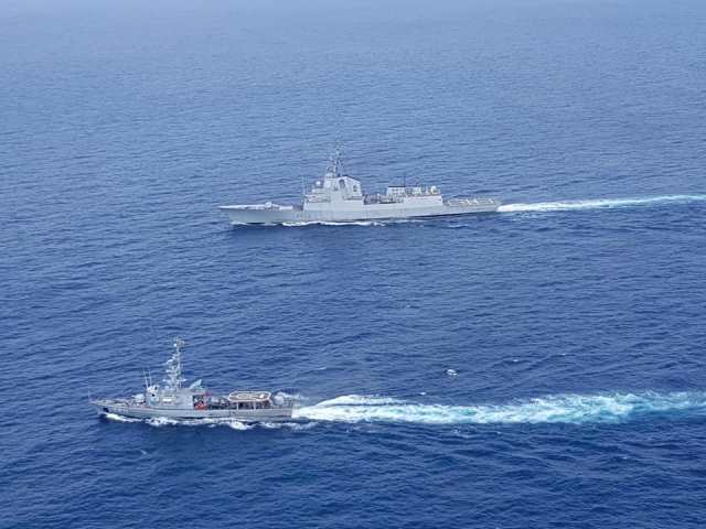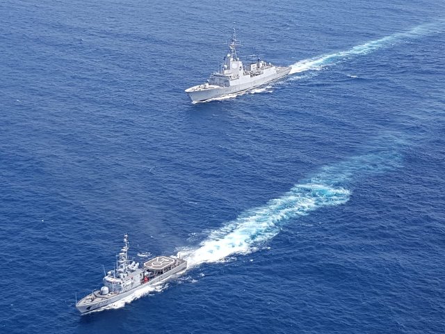 Fotografía: En primer plano la corbeta “Esmeraldas” seguida por la fragata “Méndez Núñez”. (foto: EMAD).