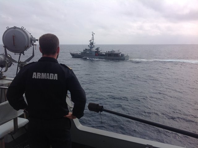 ·Un miembro de la dotación de la fragata “Méndez Núñez” observa a la corbeta misilera “Esmeraldas”. (foto: EMAD).