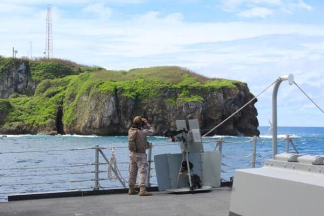 ·Imagen de un centinela de la fragata “Méndez Núñez”, mientras el navío sale de Guam, al fondo los característicos acantilados del que fue territorio español. (foto: Armada).