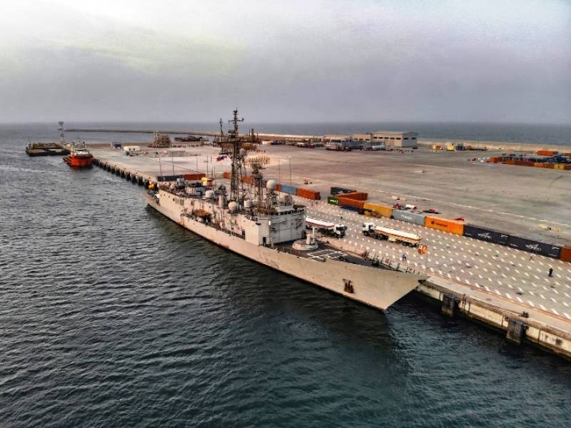 Foto: Fragata ‘Santa María’, en el puerto de Duqm (EMAD)