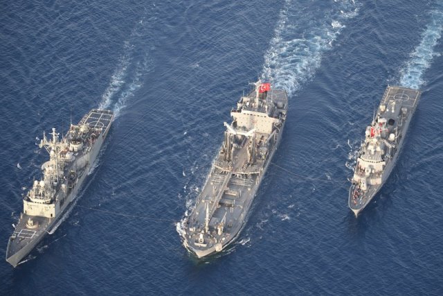 El navío logístico de las Fuerzas Navales de Turquía de la clase Akar está suministrando con las mangas sitas en su pórtico a la vez a la fragata española, situada a su estribor, y la turca de la clase Barbaros, la adaptación turca del diseño alemán MEKO 200, posicionada a babor. Es una de las típicas colaboraciones, en este caso en aguas del Mediterráneo Oriental, entre los navíos asignados a la Agrupación Naval Permanente de la OTAN nº 2 o Standing NATO Maritime Group Two (SNMG2), con las marinas militares de la Alianza o países amigos.