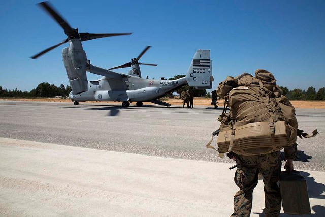·Marines del SPMAGTF-CR-AF se disponen a subir a unos de sus Osprey. Foto: USMC.