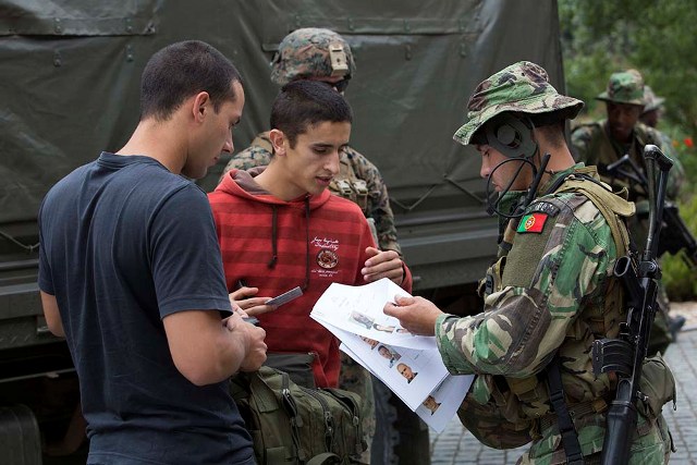 ·Un militar portugués, armado con fusil de asalto IMI Galil, revisando identidades en un control de seguridad. Foto: USMC.